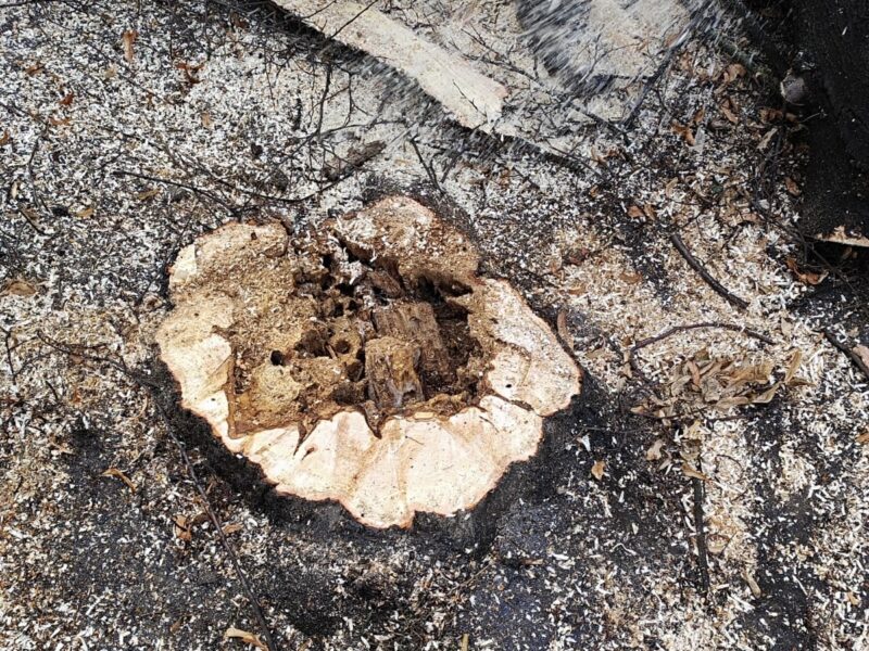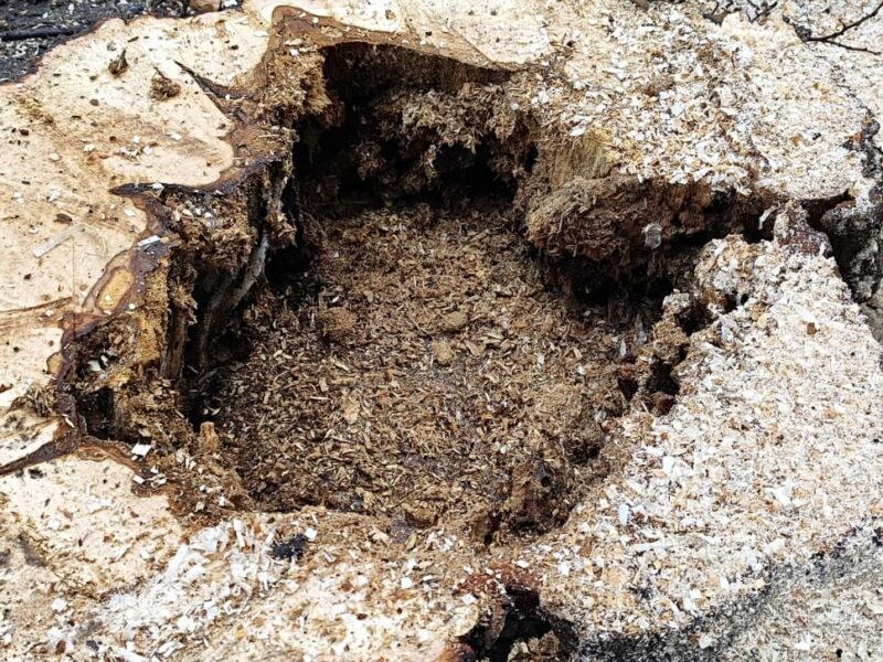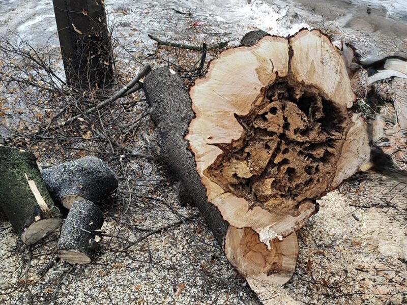Після зрізу помітно значне внутрішнє пошкодження стовбура. Серцевина уражена гниллю та частково втрачена. Такі зміни не завжди помітні зовні, однак вони впливають на стійкість дерева.